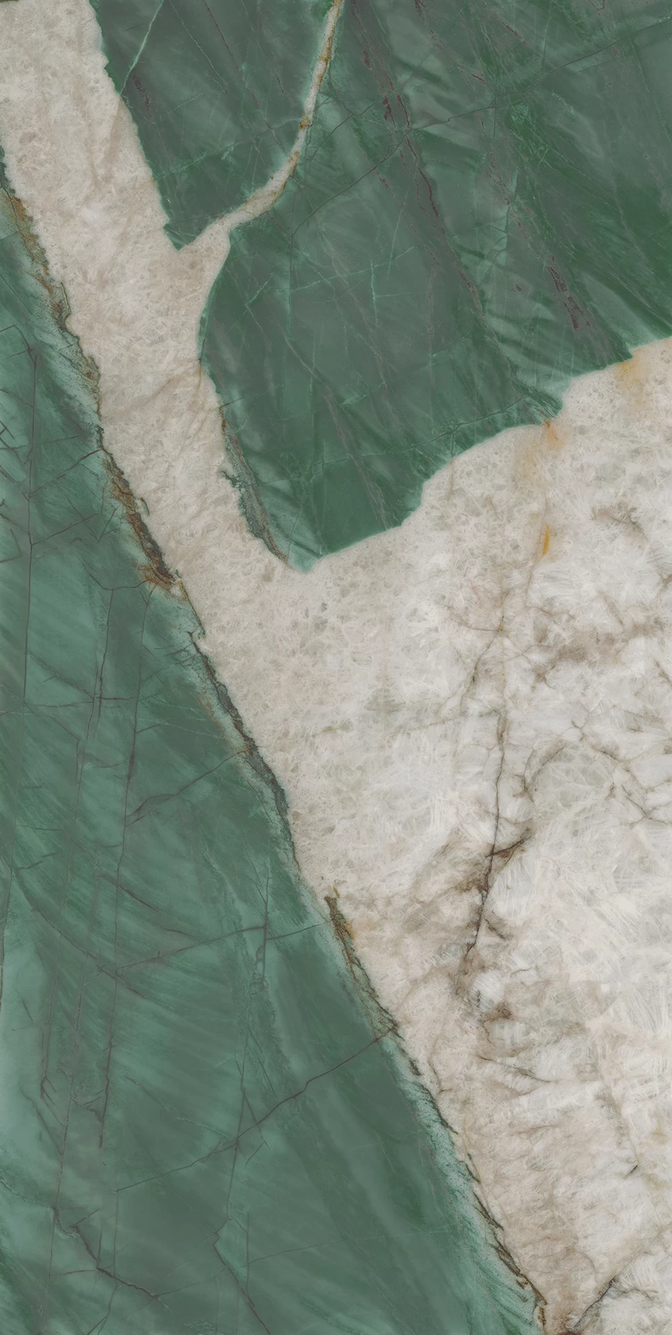 Veľké porcelánové dlaždice s mramorovým efektom. Exotic Wave, inšpirovaný brazílskym kvarcitom, ktorého povrchy sú vyleptané jasne zelenými žilami, je protagonistom živého a dynamického projektu interiérového dizajnu, ktorý pripomína zvodnú tropickú atmosféru.